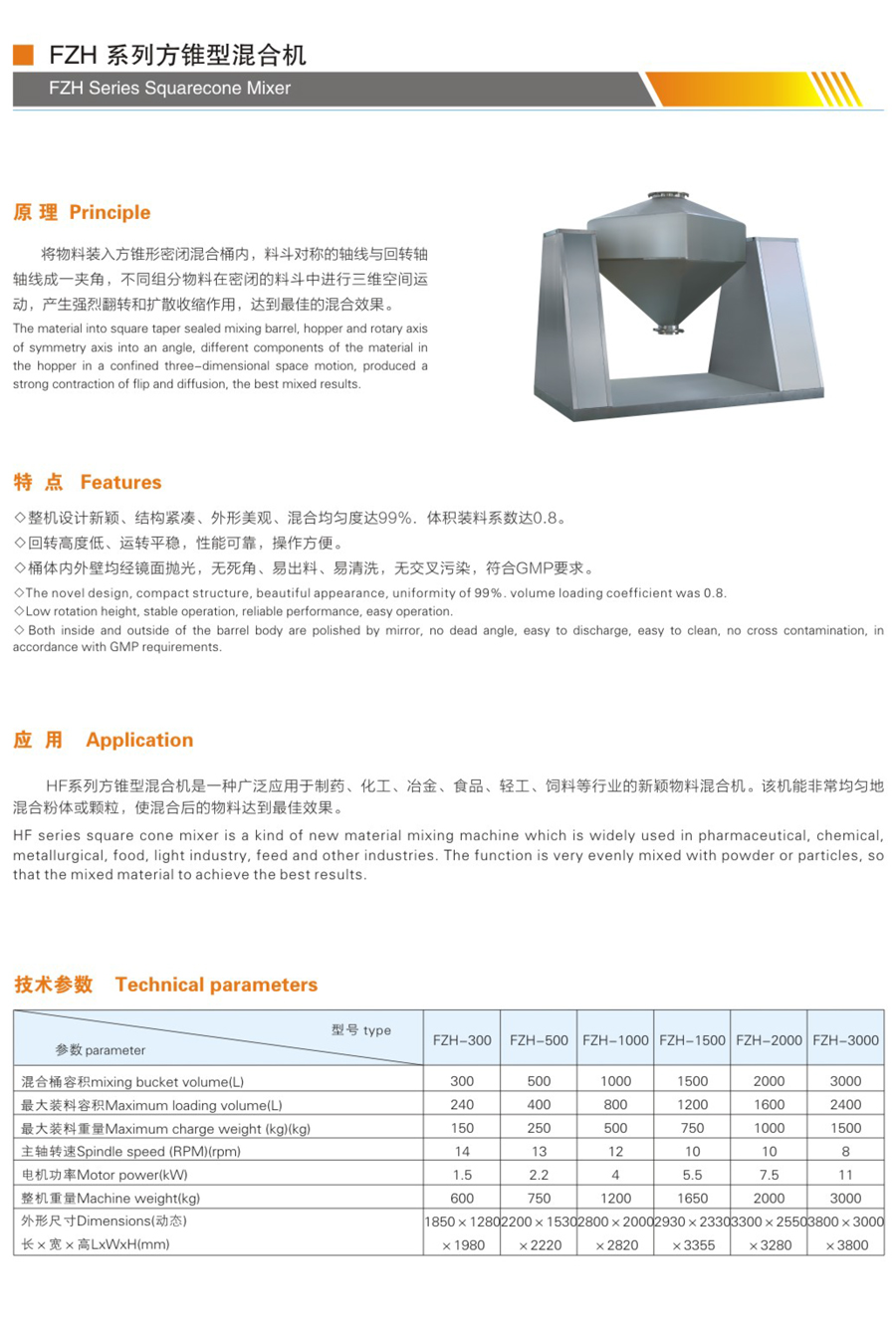 方錐混合機 FH系列方錐型混合機是一種廣泛應用于制藥、化工、冶金、食品、輕工、飼料等行業的新穎物料混合機。該機能非常均勻地混合粉體或顆粒,使混合后的物料達到最佳效果。