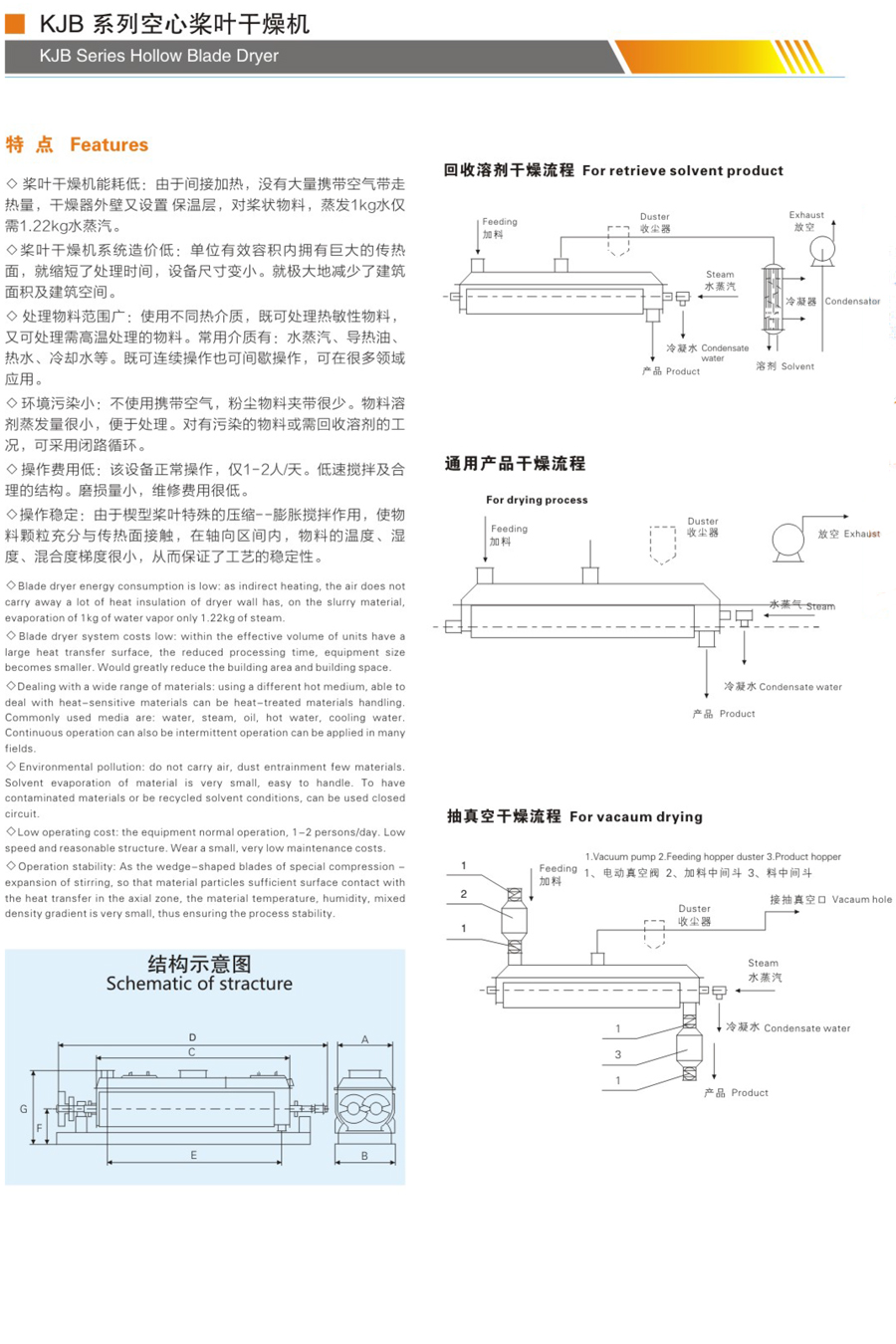 槳葉干燥機已成功地用于食品、化工、石化、染料、工業污泥等領域。設備傳熱、冷卻、攪拌的特性使之可以完成以下單元操作:煅燒(低溫)、冷卻、干燥(溶劑回收)、加熱(融化)、反應和滅菌。攪拌 槳葉同時又是傳熱面,使單位有效容積內傳熱面積增大,縮短了處理時間。楔型槳葉傳熱面又具有自清潔功能。壓縮--膨脹攪拌功能使物料混和均勻。物料沿軸向成"活塞流"運動,在軸向區間內,物料的溫度、濕度、混合度梯度很小。