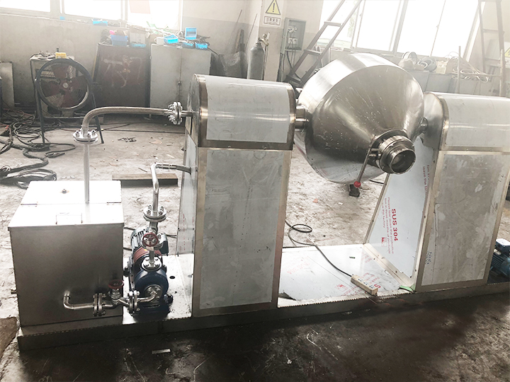 雙錐回轉真空干燥機為雙錐形的回轉罐體,罐內在真空狀態下,向夾套內通入蒸汽或熱水進行加熱,熱量通過罐體內壁與濕物料接觸,濕物料吸熱后蒸發的水汽,通過真空泵經真空排氣管被抽走。由于罐體內處于真空狀態,且罐體的回轉使物料不斷的上下內外翻動,故加快了物料的干燥速度,提高干燥效率,達到均勻干燥的目的。雙錐回轉真空干燥機系統主要由雙錐回轉真空干燥機、冷凝器、除塵器、真空抽氣系統、加熱系統、冷卻系統、電控系統等組成。