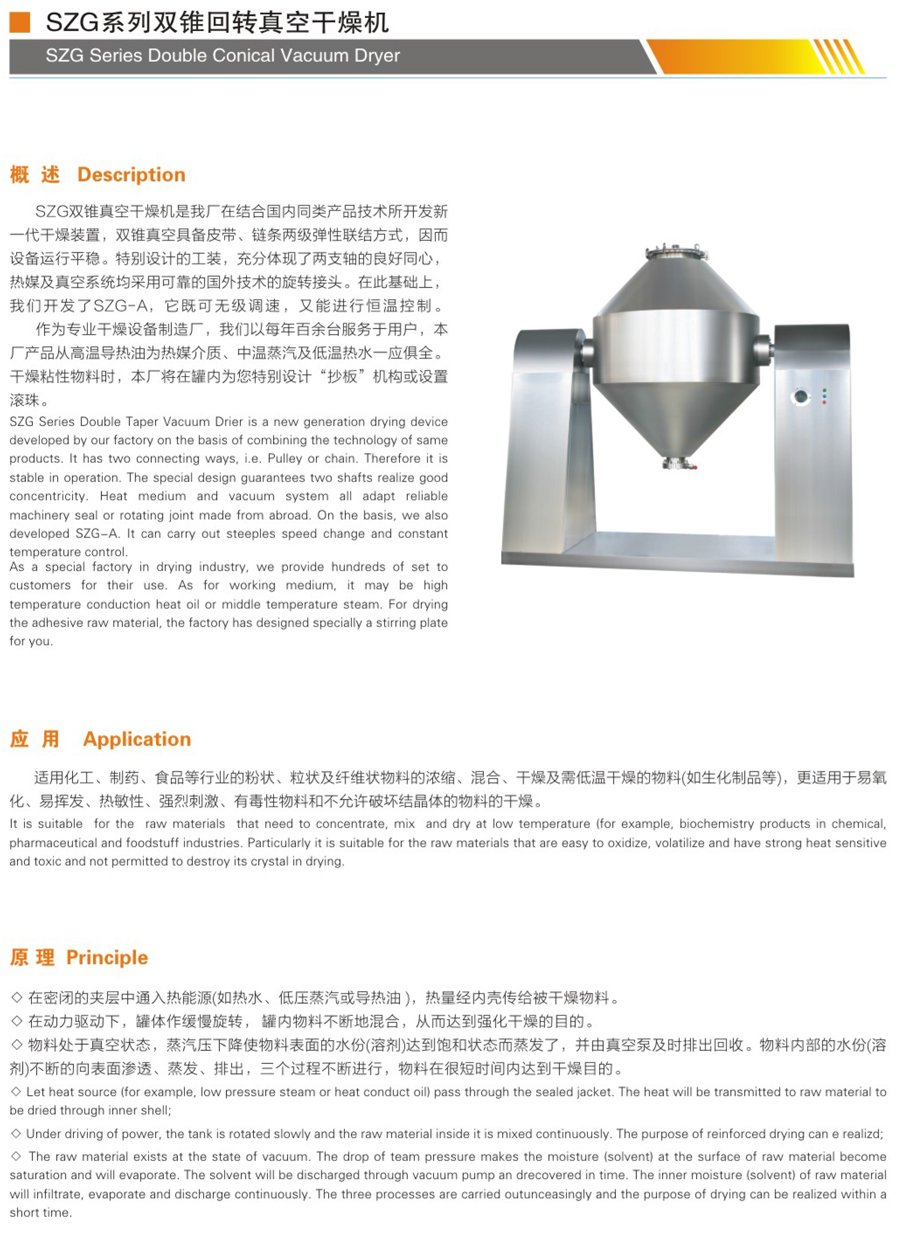 ◆適用化工、制藥、食品等行業,粉狀、粒狀及纖維狀物料的濃縮、混合、干燥及需低溫干燥的物料(如生化制品等),更適用于易氧化、易揮發、熱敏性強烈刺激、有毒性物料和不允許破壞結晶體的物料的干燥。