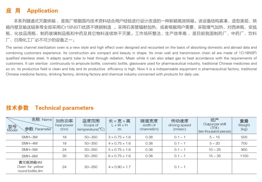 SMH系列隧道滅菌烘箱產品,廣泛應用于制藥生產的各種安瓿瓶、易拉瓶、西林瓶及其它玻璃容器的干燥、滅菌,亦可以供化工、食品、電子行業等工業部門的物料烘干之用。
